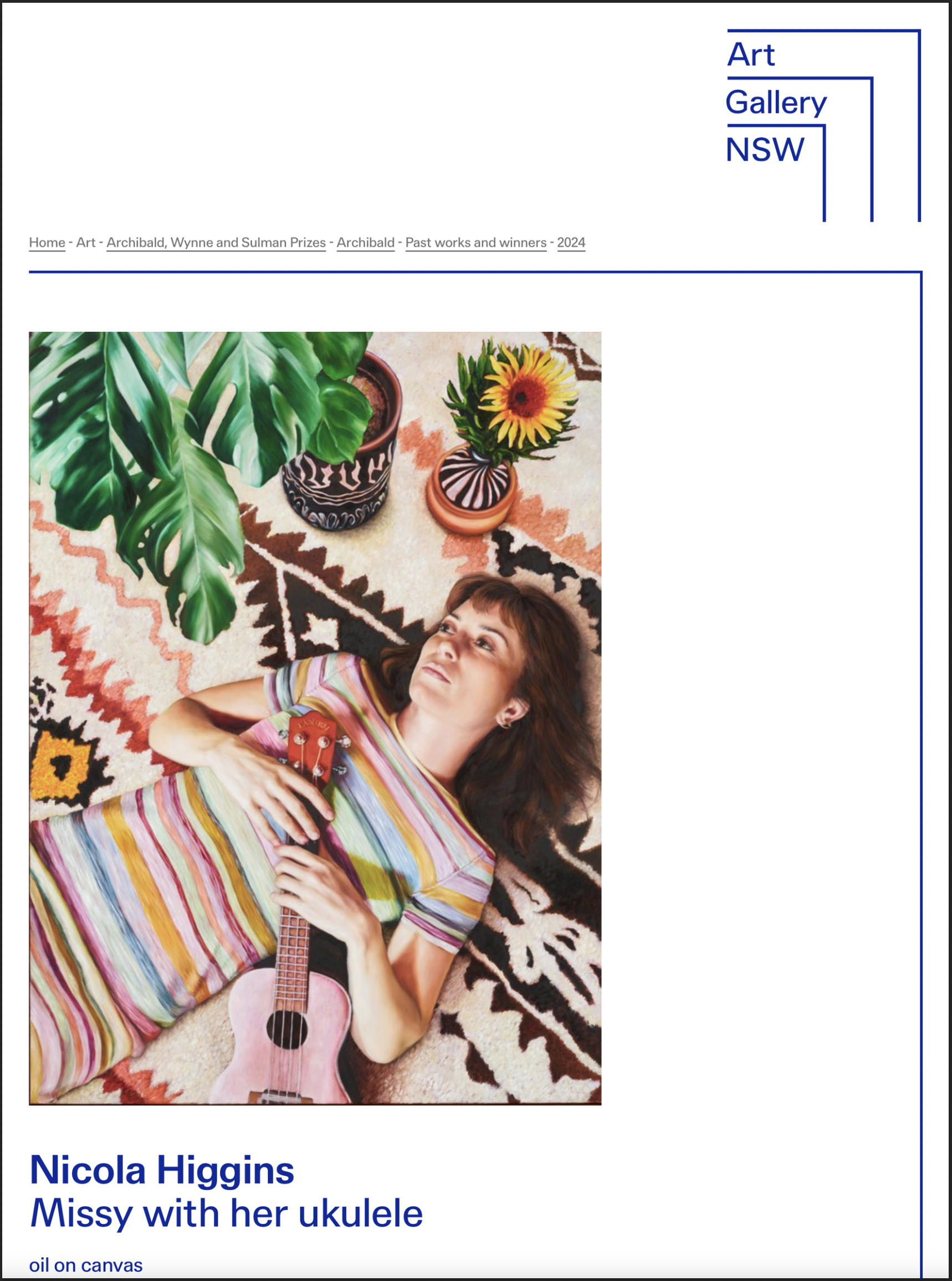 30th March 2024. Nicola Higgins, Missy with her ukulele, Archibald Prize 2024 https://www.artgallery.nsw.gov.au/prizes/archibald/2024/30651/ PDF