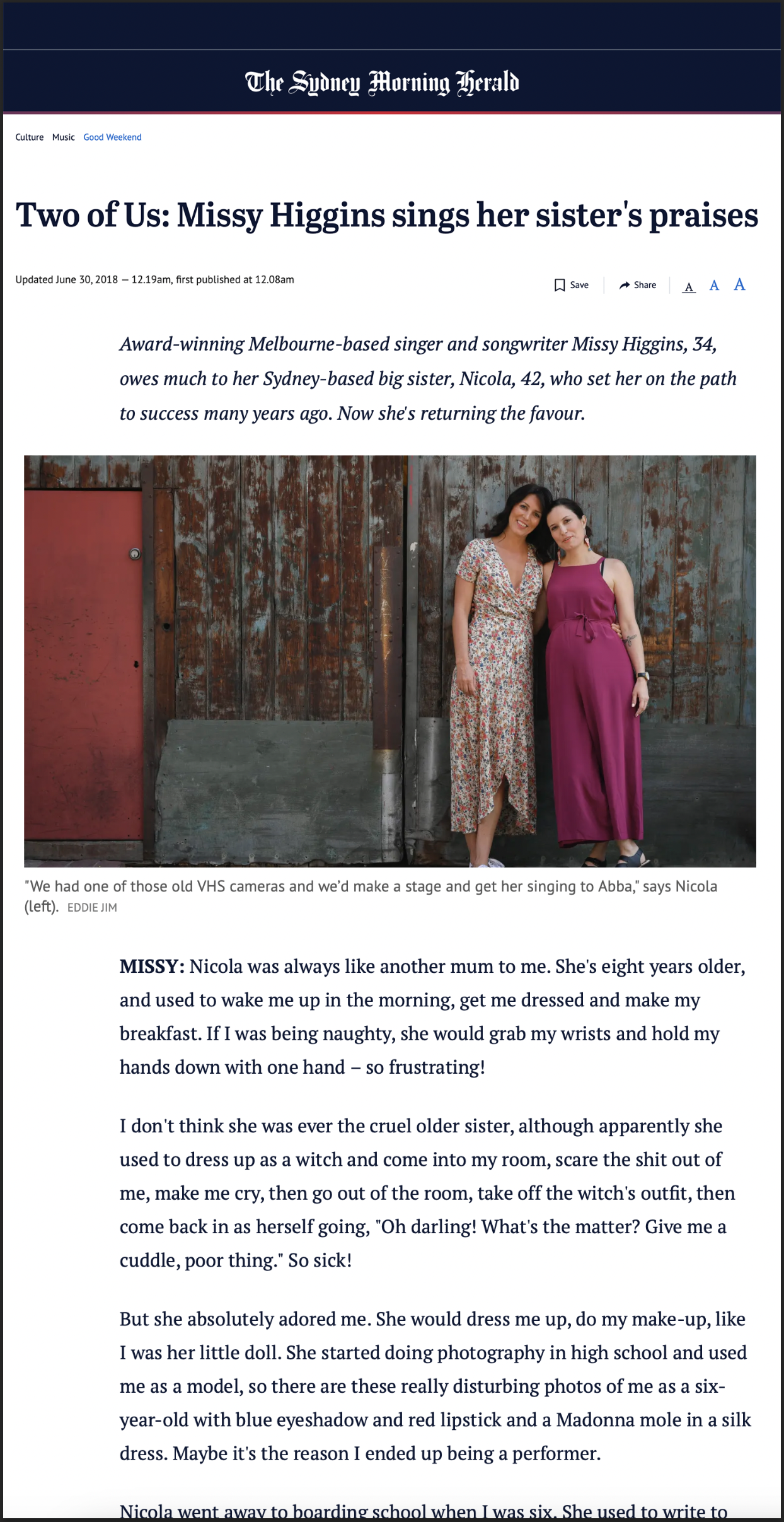 2018, June 30. Two of Us: Missy Higgins sings her sister's praises. Sydney Morning Herald. https://www.smh.com.au/entertainment/music/two-of-us-missy-higgins-sings-her-sister-s-praises-20180626-p4znsk.html PDF